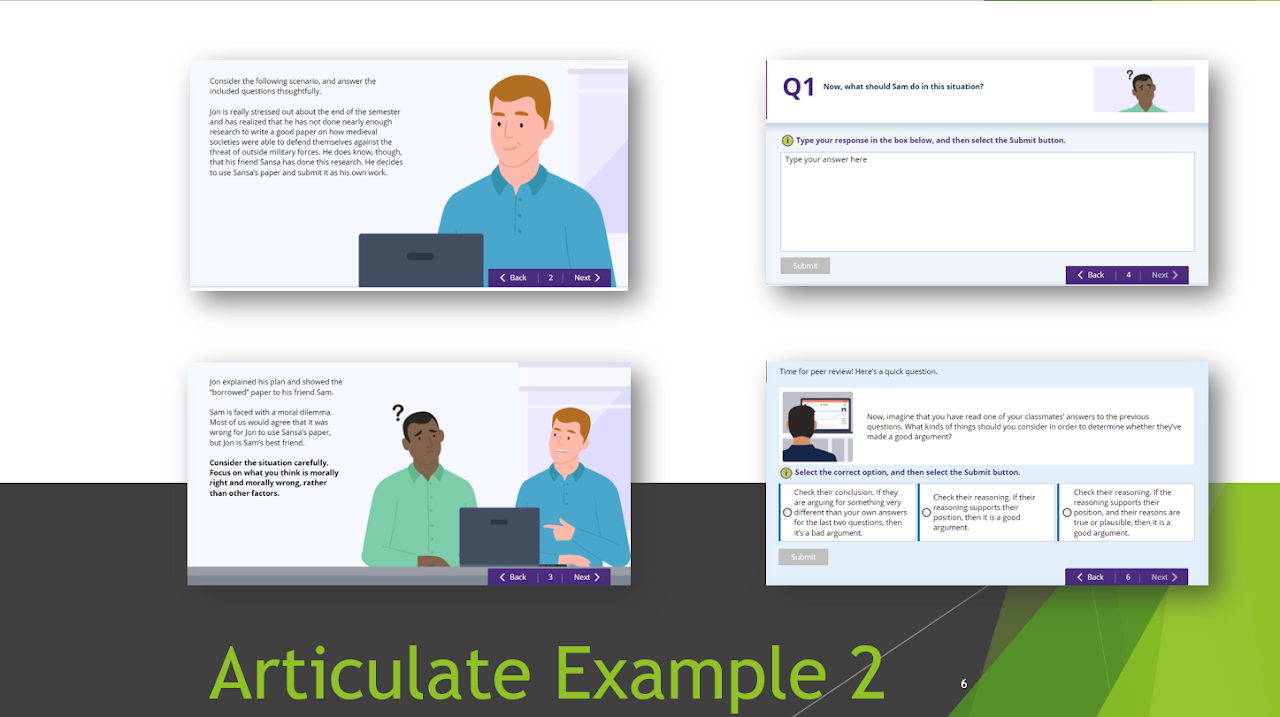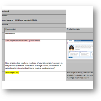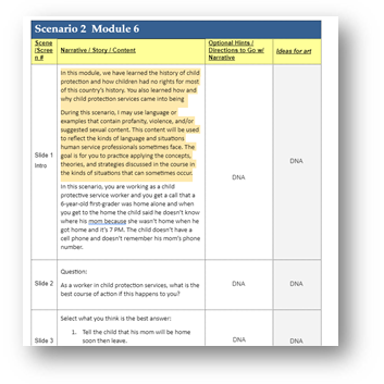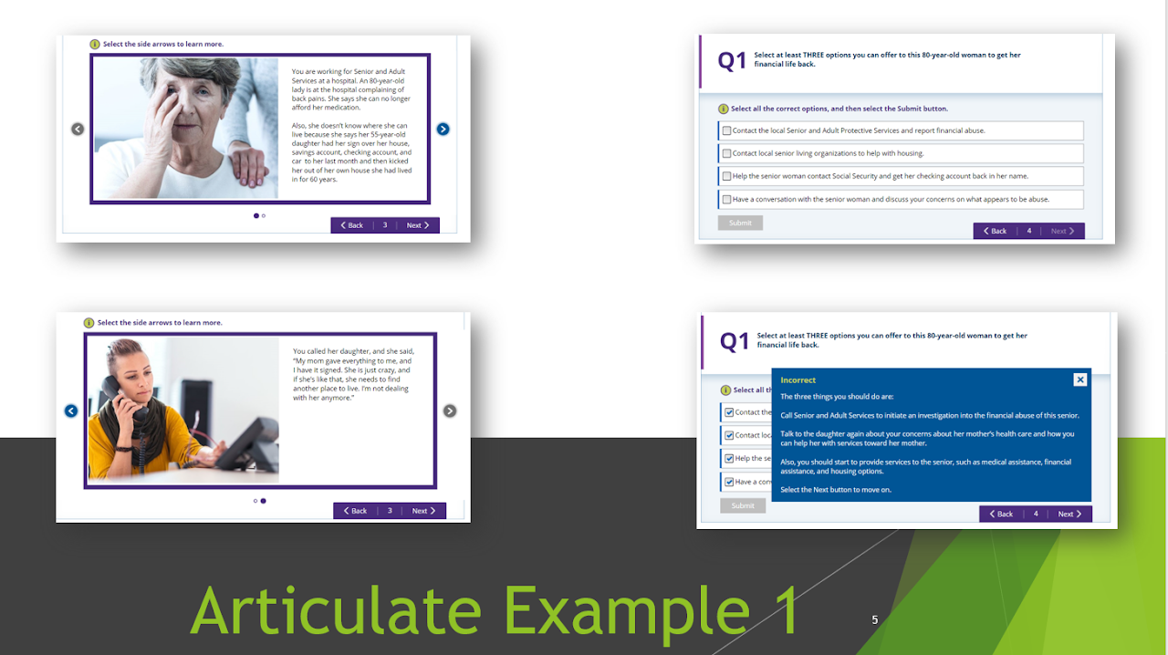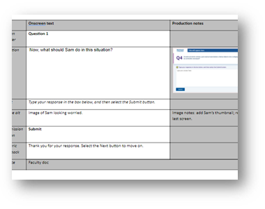Work with media team to build interactive prototypes (Articulate: scenario-based media pieces).